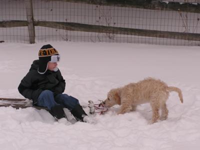 A boy and his new Goldendoodle puppy are having fun in the snow.